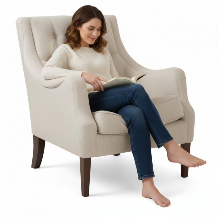 Crafted with premium soft upholstery in a versatile beige shade, it effortlessly complements both modern and traditional interiors. The cushioned seat with high-resilience foam ensures long-lasting comfort, whether you’re relaxing with a book, entertaining guests, or enjoying family time.